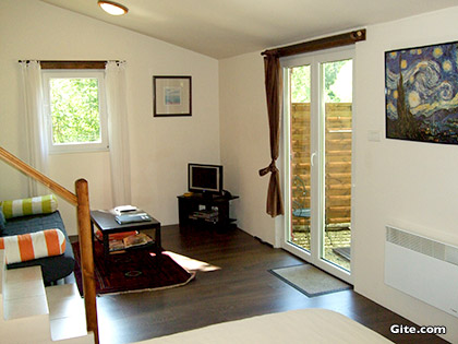 Triple French folding doors that extend to the floor open the space completely. The ceiling boasts wood panelling, while a traditional wooden railing on the staircase leads to the upper floors.